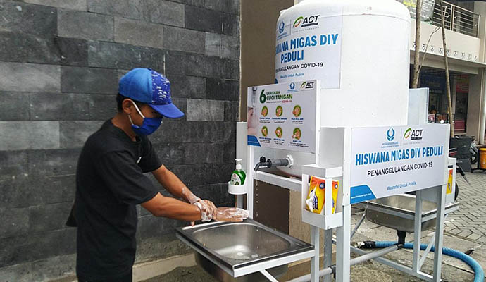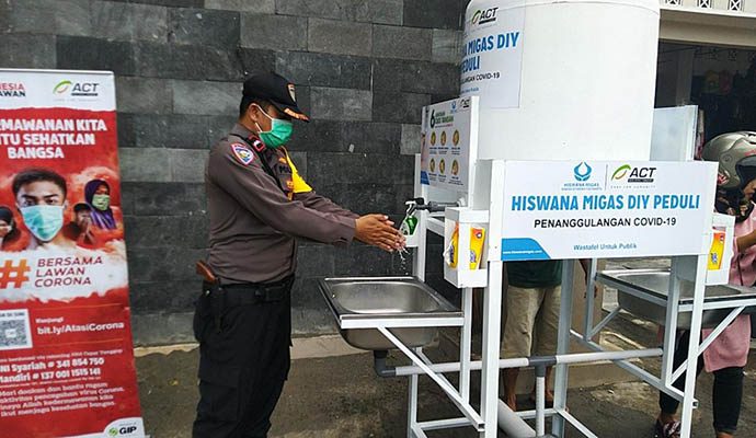 Demi memutus rantai persebaran Virus Corona, Lembaga Kemanusiaan Aksi Cepat Tanggap (ACT) DIY bersama Hiswana Migas DIY terus melakukan menyalurkan bantuan wastafel portabel di pasar-pasar tradisional Yogyakarta, Jum’at (17/4/2020).