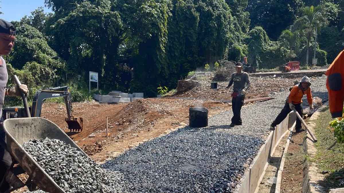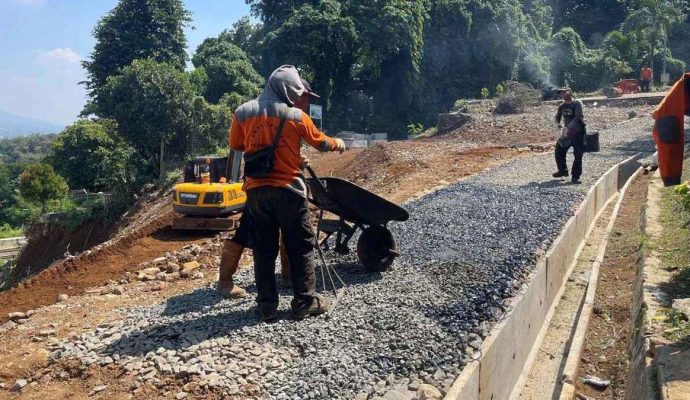 Pantauan di lapangan pada Sabtu (2/8/2025), sejumlah pekerja tampak mengangkut dan meratakan batu split di atas jalur tanah yang telah dipadatkan.