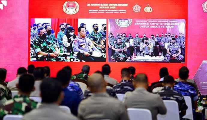 INILAHONLINE.COM, BABAKAN MADANG — Kapolri Jenderal Listyo Sigit Prabowo menghadiri acara puncak 20 tahun bakti untuk negeri alumni Akabri 2001 atau Dwipa Arya yang menggelar kegiatan vaksinasi massal, pemberian bantuan sosial, pembangunan dan renovasi 11 tempat ibadah di Sentul International Convention Center (SICC), Kabupaten Bogor, Jawa Barat, Selasa (28/12).
