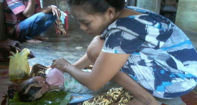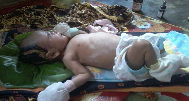 Wahyuni terlihat terus menangis menahan sakit yang mendera. Diusianya yang telah menginjak 2 bulan, kulit kepala bagian belakang dan leher bagian belakang terlihat melepuh dan mengeluarkan air dan nanah. Dibawah kepala Wahyuni terpaksa di bentangkan helaian daun pisang. Kondisi ini diawali saat kepala dan leher Wahyuni membengkak pada saat usia 2 minggu.