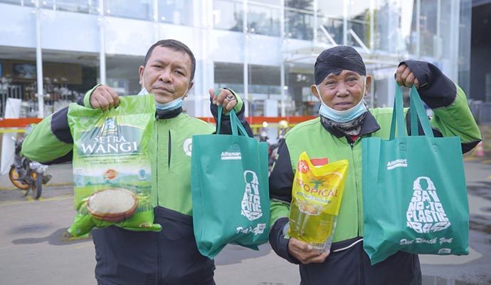 Wabah virus Covid-19 berdampak terhadap merosotnya pendapatan para pekerja non informal, seperti ojek online. Demi membantu memenuhi kebutuhan mereka sehari-hari, khususnya dalam pemenuhan sembako, PT Sumber Alfaria Trijaya Tbk (Alfamart) menyalurkan bantuan kepada 30.000 mitra GoJek.