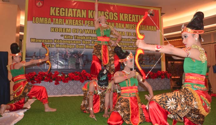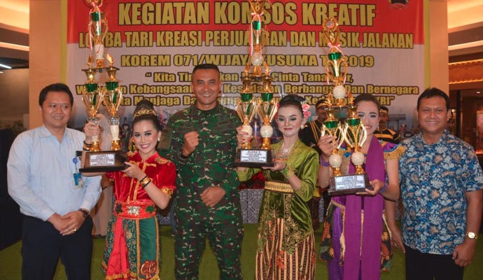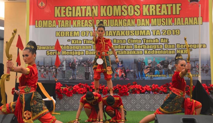 Komunikasi sosial kreatif Korem 071/Wijayakusuma mengambil tema, “Melalui kegiatan komsos kreatif, kita tingkatkan rasa cinta tanah air, wawasan kebangsaan dan kesadaran berbangsa dan bernegara serta menjaga dan mempertahankan kedaulatan NKRI”, menggelar Tari Kreasi Perjuangan, Melukis dan Musik Jalanan, diikuti 27 peserta perwakilan Kodim jajaran Korem 071/Wijayakusuma.