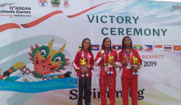 Suasana gembira menerpa wajah Atlet renang Adelia kembali meraih medali emas keduanya, dalam cabang olahraga renang nomor 100 meter gaya dada dalam pagelaran Asean School Games XI 2019, di gelora Jatidiri Semarang, Sabtu (20/07/19).