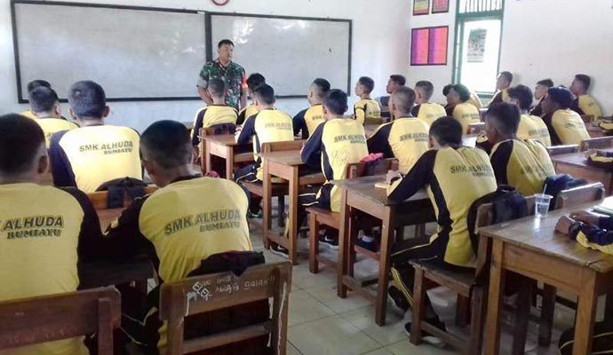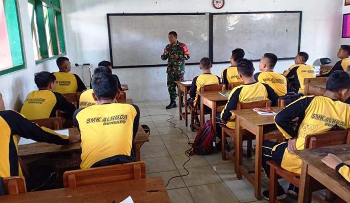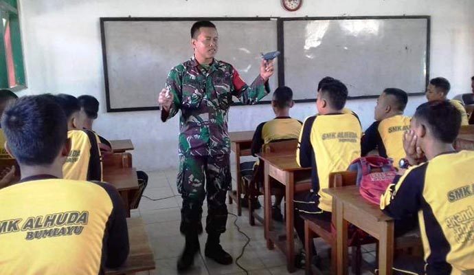 Seperti halnya para Babinsa dari Koramil 08 Bumiayu Kodim 0713 Brebes, memberikan pembekalan bela negara dan bimbingan mental kepada 62 orang siswa kelas XII atau kelas 3, SMK Al Huda Bumiayu, Jalan KH. Nasucha No. 56 Krajan, Kecamatan Bumiayu, Kabupaten Brebes, Jawa Tengah. Senin siang (14/1/2020).