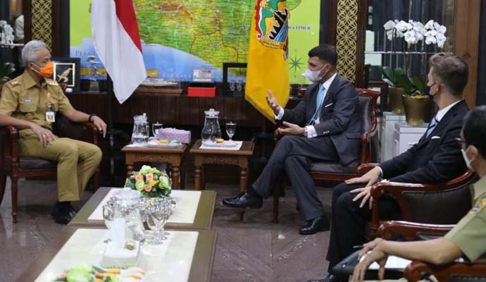 INILAHONLINE.COM, SEMARANG – Duta Besar Austria untuk Indonesia, Johannes Peterlik menemui Gubernur Jawa Tengah, Ganjar Pranowo, Senin (14/6). Pertemuan yang berlangsung di ruang kerja Ganjar Pranowo itu, dibahas sejumlah peluang kerjasama, diantaranya sektor pendidikan dan UMKM.