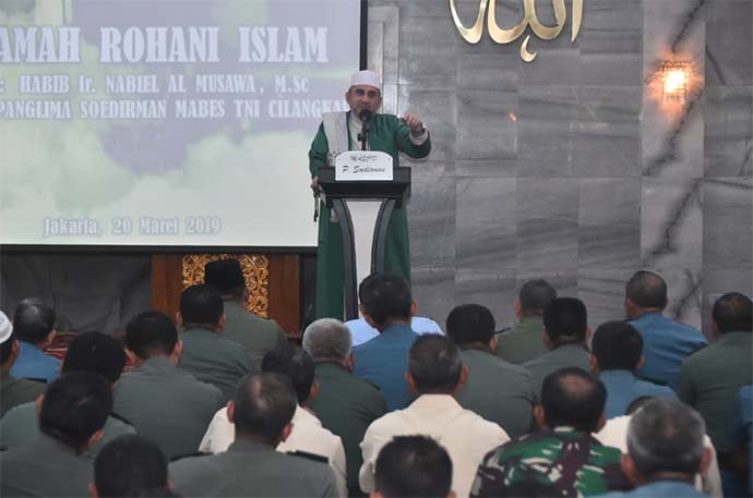 Kepala Staf Umum TNI, Letjen TNI Joni Supriyanto bersama segenap Prajurit dan PNS Mabes TNI serta Ibu-ibu Ikatan Kesejahteraan Keluarga TNI Pragati Wira Anggini (IKKT PWA) mengikuti ceramah rohani Islam di Masjid Sudirman Mabes TNI, Cilangkap, Jakarta Timur, Rabu (20/3/2019).
