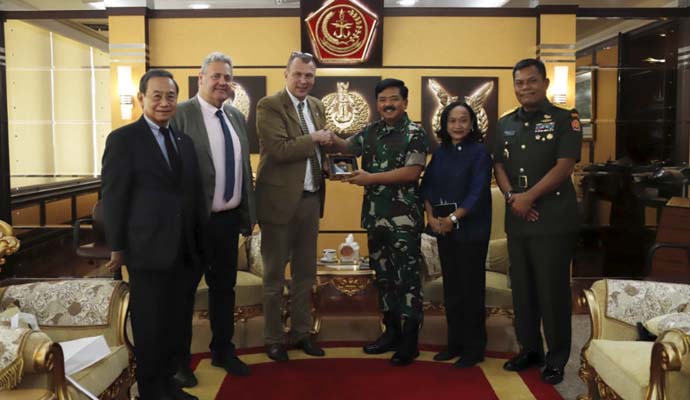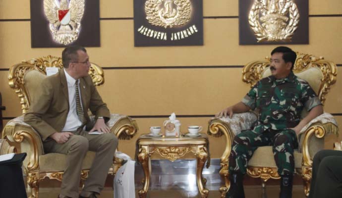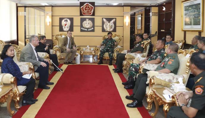 Panglima TNI Marsekal TNI Hadi Tjahjanto, S.I.P. didampingi Kasum TNI Letjen TNI Joni Supriyanto menerima audiensi Ketua Delegasi ICRC untuk Indonesia dan Timor Leste Mr Alexandre Faite dan rombongan di Mabes TNI, Cilangkap, Jakarta Timur, Senin (1/7/2019). Dalam pertemuan tersebut, Mr. Alexandre Faite menyampaikan terima kasih dan penghargaan yang setinggi-tingginya kepada TNI yang telah bekerja sama dengan sangat profesional sebagai co-host kegiatan International Conference dengan tema “Preparing Modern Armed Forces for Peacekeeping Operations in the 21st century” pada tanggal 25-27 Juni 2019. (Puspen TNI)