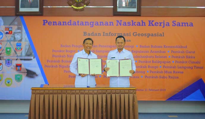 Wali Kota Bogor Bima Arya menghadiri acara penandatanganan kesepakatan bersama dan perjanjian kerjasama antara Badan Informasi Geospasial (BIG) dengan Kementerian/Lembaga serta Pemerintah Daerah di Aula Utama BIG, Jalan Raya Jakarta-Bogor KM 46, Cibinong, Kamis (21/2/2019).