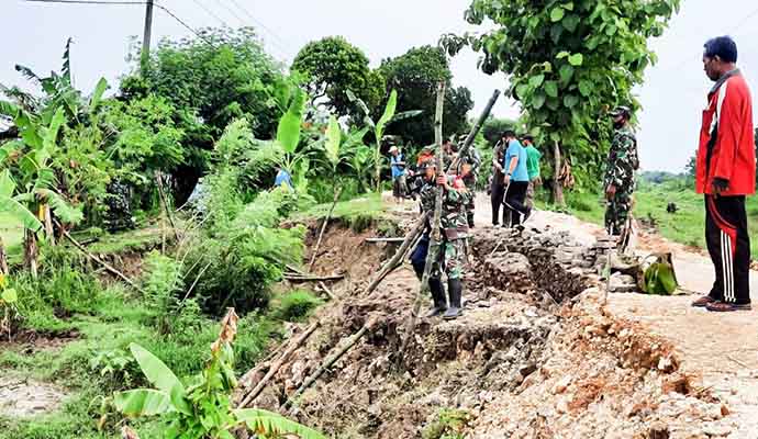 Untuk penanggulangan melebarnya longsoran bibir jembatan yang berada di Desa Semenkidul, Kecamatan Sukosewu, Bojonegoro, akibat hujan deras yang terjadi diwilayah Sukosewu pada Kamis (3/12/2020) lalu, jajaran TNI Koramil 0813-21/Sukosewu bersama BPBD Bojonegoro dan elemen masyarakat gotong-royong memasang Tanggul Penahan Tanah dari tancapan bambu disekitar longsoran tersebut.