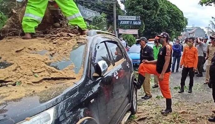 Sebuah mobil tertimpa pohon tumbang di Jalan Dadali Rt 02/06, Kelurahan Tanah Sereal, Kecamatan Tanah Sereal, Kota Bogor, sekitar pukul 14 20 WIB. Penyebab pohon tumbang terjadi angin kencang .