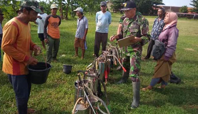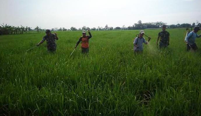 Menyikapi tugas capaian tersebut, TNI yang sudah MoU dengan Kementan RI, terus melakukan upaya guna mendorong para petani mempercepat tanam dan menambah luas tanam. Seperti yang dilakukan Serka Jamaludin, Babinsa Koramil 06 Kersana Kodim 0713 Brebes bersama Sriyani, Staf BP3K Dintan Kabupaten Brebes, melaksanakan pendampingan kepada 20 orang petani dari Kelompok Tani (Poktan) Mekarsari di areal persawahan seluas 15 hektar Desa Sindangjaya dengan penyemprotan hama padi blas. Rabu (6/2/2019).