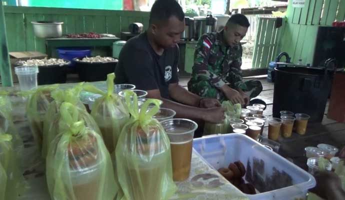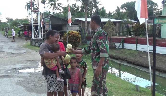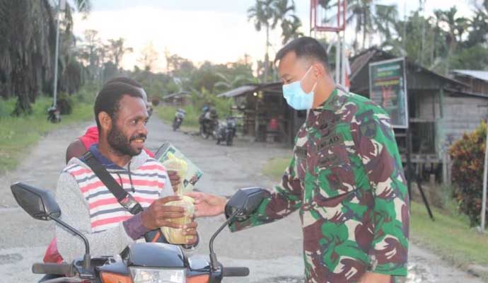 INILAHONLINE.COM, KEEROM – Dalam rangka memupuk hubungan yang harmonis antar umat beragama di bulan suci Ramadhan 1442 H, Pos Kout Arso Tami Satgas Pamtas Yonif 403/Wirasada Pratista membagikan Takjil kepada masyarakat di Kampung Workwana, Distrik Arso, Kabupaten Keerom, Papua.