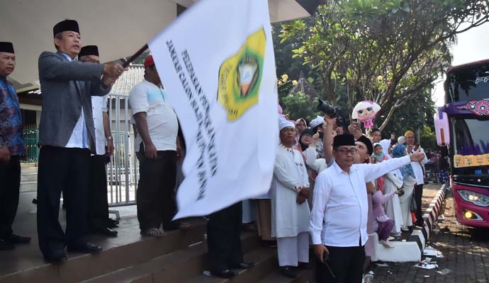 Sekretaris Daerah (Sekda) Kabupaten Bogor, Burhanudin melepas calon jamaah haji kloter 01 Kabupaten Bogor yang terdiri dari 404 jamaah dan 6 petugas pendamping serta tim medis, bertempat di Gedung Tegar Beriman, Cibinong, Sabtu (6/7).
