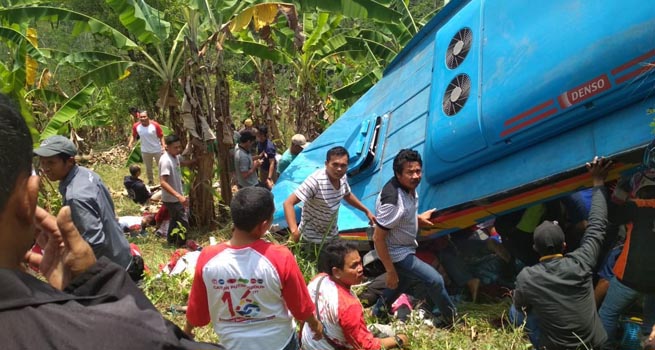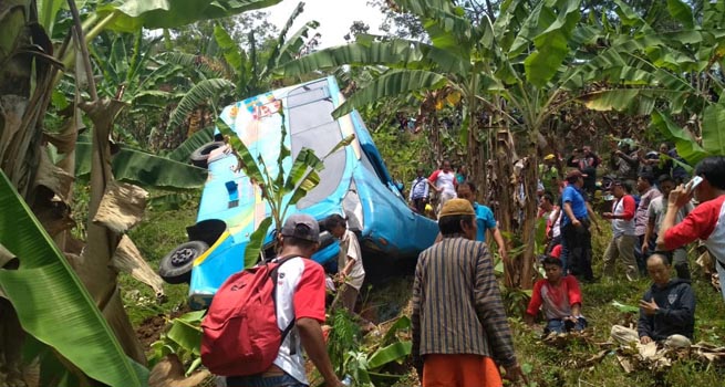Bus meluncur ke jurang setinggi 30 meter. Bus terguling sebelum berhenti di kebun pisang. Beberapa korban meninggal akibat terjepit badan bus. Mayat bergelimpangan di lokasi kejadian.