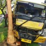 Diduga Mengantuk, Truk Pengangkut Air Hantam Pohon dan Pembatas Jalan