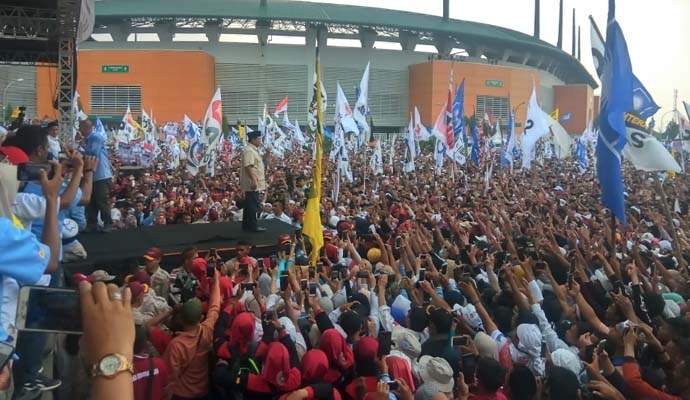 Ribuan masyarakat Kabupaten Bogor menghadiri kampanye akbar Capres nomor urut 02 Prabowo Subianto yang digelar di gate 8 halaman parkir Stadion Pakansari, Cibinong, Bogor, Jum’at (29/3).