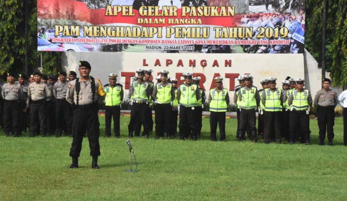 Melihat pentingnya pengamanan dalam pemilu, Polres Madiun bekerja sama dengan Kodim 0803/Madiun dan instansi terkait lainnya menggelar Apel Gelar Pasukan dalam Rangka Pam Menghadapi Kampanye Terbuka Pemilu Tahun 2019 bertempat di Lapangan Tri Brata Polres Madiun, Jum’at (22/03/2019)