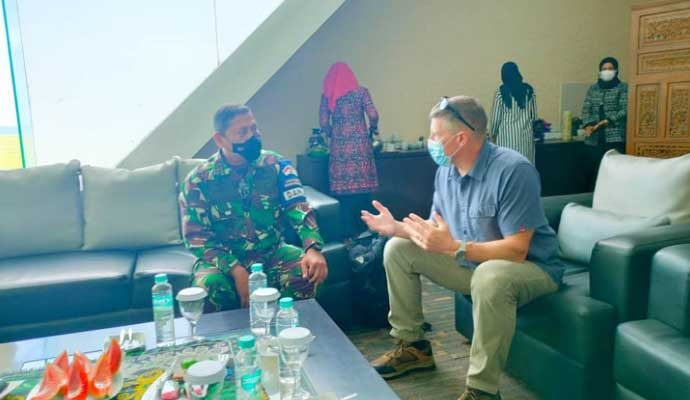 Didampingi Irjenad Letjen TNI Benny Susianto, selaku peninjau Latma dari Mabesad, Pangdam VI/Mlw Mayjen TNI Heri Wiranto dan Wadan Kodiklatad Mayjen TNI Kasuri, peninjau Latma dari Kodiklatad serta Kapok Sahli Pangdam VI/Mlw Brigjen TNI Erwin Herviana Suherman sesaat setelah meninjau puncak latihan offensive operation perebutan kedudukan main objective di Puslatpurat Kodam VI/Mlw di Amborawang, Dankodiklatad melaksanakan ramah tamah dengan Brigadier General Joseph A. Ryan.