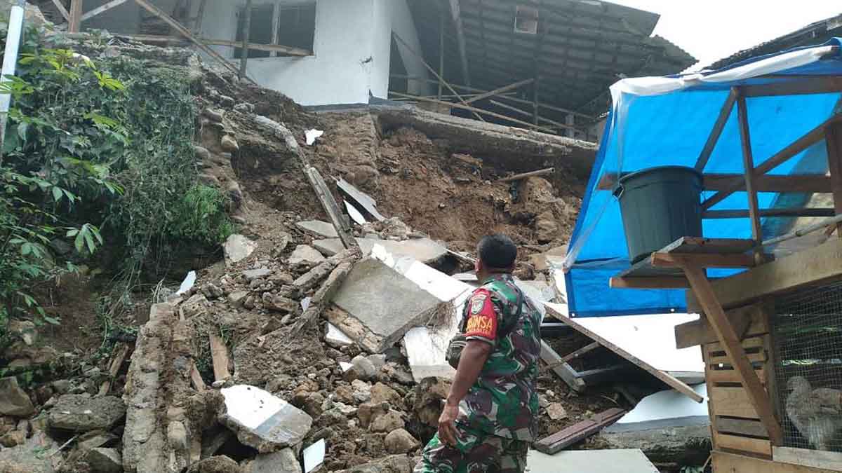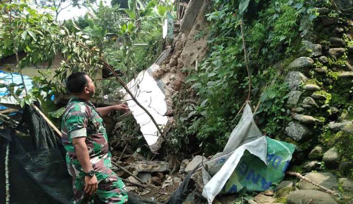 INILAHONLINE.COM, MEGAMENDUNG — Danramil 0621-10/Cisarua – Megamendung Eka Purnama meninjau lokasi kejadian bencana alam tanah longsor di Kecamatan Megamendung, Kabupaten Bogor, Minggu (25/06/22).
