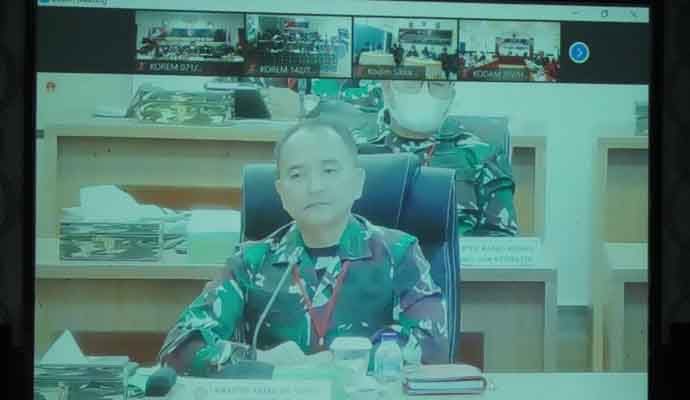 Komandan Korem 071/Wijayakusuma, Kolonel Inf Dwi Lagan Safrudin, S.I.P., selaku PKP (Penanggungjawab Keberhasilan Pelaksanaan) mengikuti Video Conference (Vicon) rapat koordinasi Tentara Manunggal Membangun Desa (TMMD) Ke-110 Tahun 2021, Kamis (18/2/2021) di Aula Jenderal Sudirman Makorem 071/Wijayakusuma, Sokaraja, Banyumas.