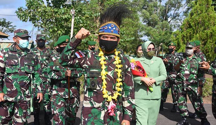 Komandan Korem 174/Anim Ti Waninggap (Danrem 174/ATW) Kodam XVII/Cenderawasih Kolonel Inf Bangun Nawoko beserta Isteri Ibu Renny melakukan kunjungan kerja ke Batalyon Infanteri 757/Ghubta Vira (Yonif 757/GV) di Kampung Salor, Distrik Kurik, Kab. Merauke, Papua, Rabu (27/5/2020).
