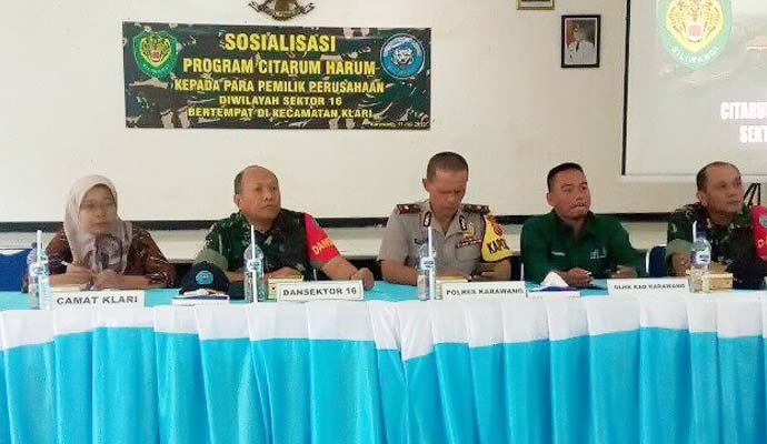 Terkait dengan program perintah mengenai Citarum Harum Komandan Sektor (Dansektor) 16 Satgas Citarum Harum Kol Inf Imam Firdaus Budhiarto, memberikan sosialisasi kepada Para Pemilik Perusahaan di wilayah Sektor 16 di aula Kecamatan Klari Kabupaten Karawang Jawa barat. Kamis (11/7/2019).
