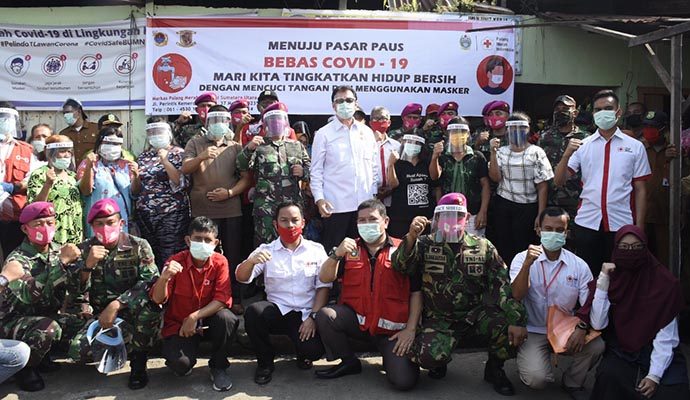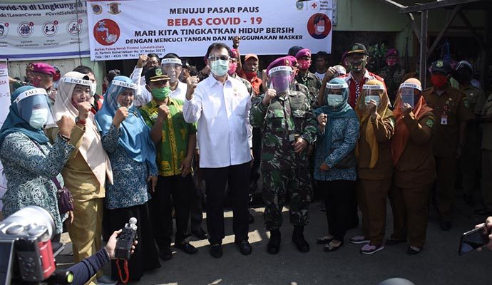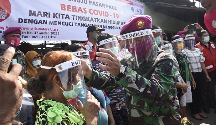 Sebelumnya, di hari yang sama, kedua tokoh ini sudah berkunjung ke Pasar Paus, Kelurahan Belawan Bahagia, Medan. Di dampingi para relawan dan para prajurit “Si Hantu Laut” mereka membagikan face shield untuk wajah kepada para pedagang. Selain itu juga menyampaikan pencerahan berupa sosialisasi protokol kesehatan menghadapi Covid-19. Terdengar seruan untuk tetap mentaati protokol kesehatan dalam menyambut suasana New Normal. Pedagang dan masyarakat pengunjung Pasar dihimbau membiasakan diri mencuci tangan sebelum dan setelah memasuki pasar di tempat tempat dan sarana yang sudah disiapkan.