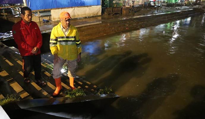 Selepas isya Ganjar tiba di sekitar bawah jembatan tol Kaligawe Semarang. Mengenakan mantel dan sepatu boot, Ganjar langsung ngecek beberapa titik genangan air.