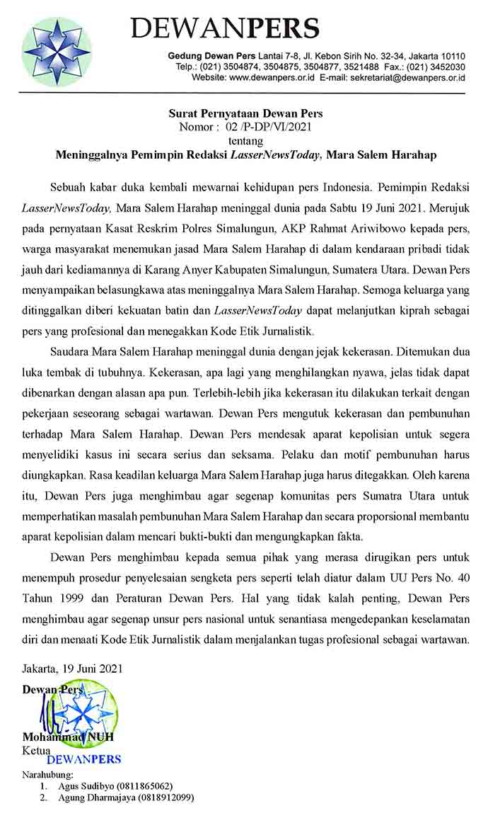 Merujuk pada pernyataan Kasat Reskrim Polres Simalungun AKP Rahmat Ariwibowo kepada pers, warga masyarakat menemukan jasad Mara Salem Harahap di dalam kendaraan pribadi tidak jauh dari kediamannya di Karang Anyer Kabupaten Simalungun, Sumatera Utara. Dewan Pers menyampaikan belasungkawa atas meninggalnya Mara Salem Harahap.