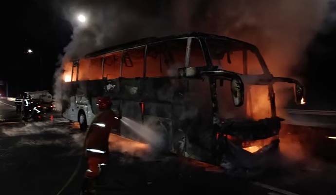 Seluruh awak bus dievakuasi keluar sesaat sebelum api berkobar membakar bus.