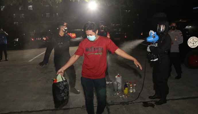 Sebelum para warga diperbolehkan pulang, terlebih dahulu mereka mengantre untuk dilakukan penyemprotan cairan disinfektan dengan mesin uap dari personel Brimob. Hal itu dilakukan, guna memastikan sterilisasi tubuh serta barang bawaan warga sehabis perjalanan.(Suparman)