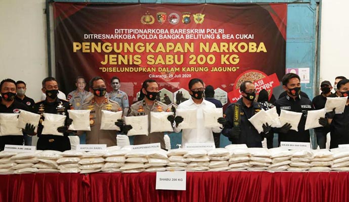 Direktorat Tindak Pidana Narkoba Bareskrim Polri, Polda Bangka Belitung dan Bea Cukai mengungkap peredaran narkotika jenis Sabu seberat 200 Kilogram yang berasal dari jaringan internasional.