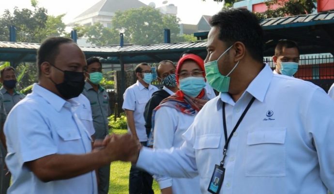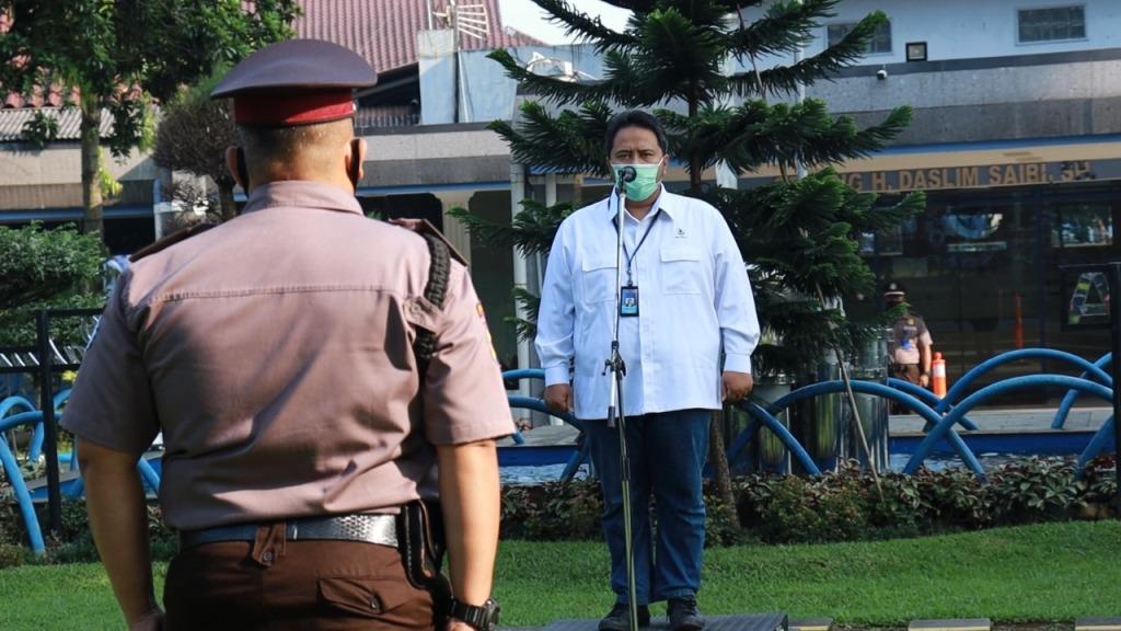 INILAHONLINE.COM, BOGOR – Direktur Utama Perusahaan Umum Daerah (Dirut Perumda) Tirta Pakuan Kota Bogor Rino Indira Gusniawan memipin langsung apel kesiapan petugas piket siaga Idul Fitri 1442 H di lapangan upacara kantor Tirta Pakuan, Rabu (12/5/2021).