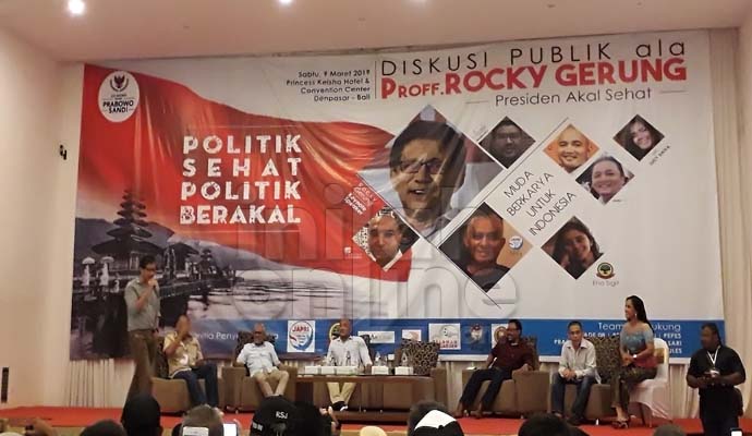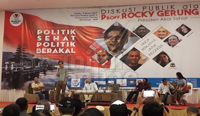 Kedatangan Mantan Akademisi Universitas Indonesia dan Pendiri Institut Setara yakni Rocky Gerung ke Bali mendapat sambutan hangat dari para pendukungnya. Rocky Gerung hadir di Aula Hotel Princess Keisha and Convention Centre di Jalan Teuku Umar No 350 Denpasar Bali pada Sabtu (9/3/2019) petang.