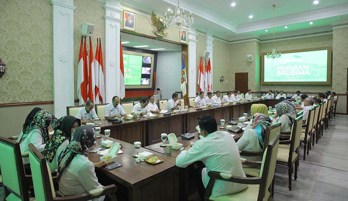 Wali Kota Bogor, Bima Arya bersama Wakil Wali Kota Bogor, Usmar Hariman dan Sekretaris Daerah (Sekda) Kota Bogor, Ade Sarip terlihat kompak saat memimpin jalannya kegiatan briefing staf yang dilaksanakan di ruang Paseban Sri Bima, Balai Kota Bogor, Kamis (04/04/2019) pagi.