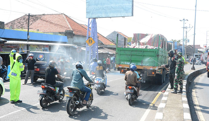 Pemerintah Kabupaten Brebes, Kodim 0713 Brebes dan Polres Brebes kembali melakukan penyemprotan cairan disinfektan, kali ini dilakukan di perbatasan Jawa Tengah-Jawa Barat, tepatnya di Jembatan Cisanggarung, Kecamatan Losari, Kabupaten Brebes, Jawa Tengah. Jum’at (27/03/2020).