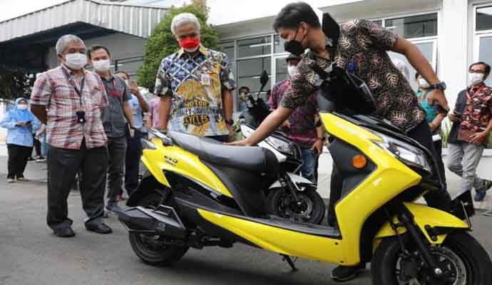Ganjar datang ke Kudus untuk meninjau proses pembuatan motor listrik itu, Rabu (3/11/2021). Selain melihat-lihat desain hingga proses pembuatan, Ganjar juga menjajal motor listrik buatan anak bangsa itu.