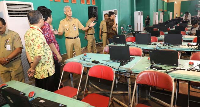 Gubernur Jawa Tengah Ganjar Pranowo meninjau tes CPNS di Kota Magelang, Senin (29/10). Berbeda dengan di Kabupaten Semarang, pelaksanaan di Gedung Wiworo Wiji Pinilih Magelang berlangsung lancar.
