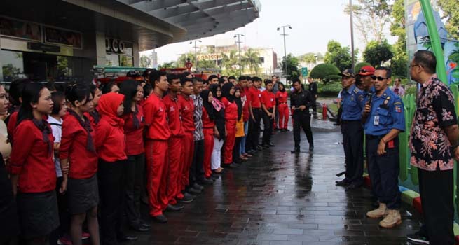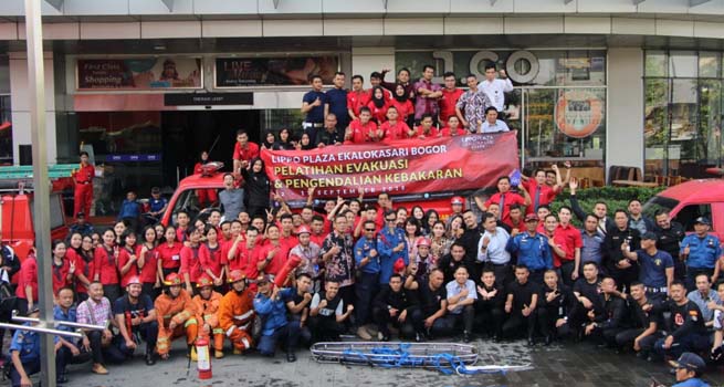 Pelatihan simulasi penanggulangan bahaya kebakaran dan penyelamatan, selain karyawan, security dan pengelola gedung Lippo Mall plaza Ekalokasari Bogor, pihak pemadam kebakaran juga menggandeng tim penyelamat dari Satpol PP Kota Bogor.