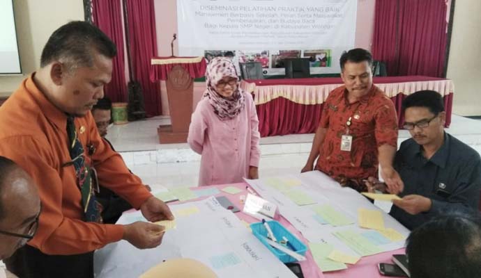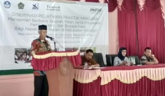 Seluruh Kepala SMP Negeri di Kabupaten Wonogiri mengikuti pelatihan penguatan manajemen berbasis sekolah dan peran serta masyarakat dari Program Pengembangan Inovasi untuk Kualitas Pembelajaran (PINTAR) Tanoto Foundation. Kegiatan Diseminasi ini difasilitasi oleh Dinas Pendidikan dan Kebudayan Kabupaten Wonogiri bekerjasama dengan Program PINTAR.