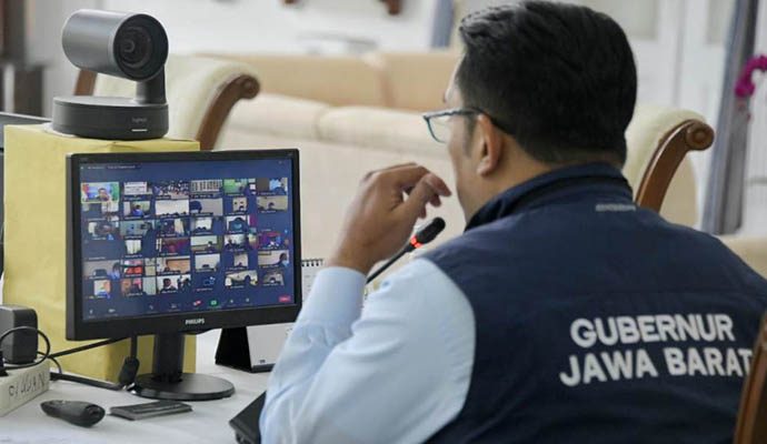 Gubernur Jawa Barat (Jabar) Ridwan Kamil memberikan sambutan dalam acara Peresmian Rumah Sakit Lapangan COVID-19 Kota Bogor via konferensi video dari Gedung Pakuan, Kota Bandung, Senin (18/1/2021).
