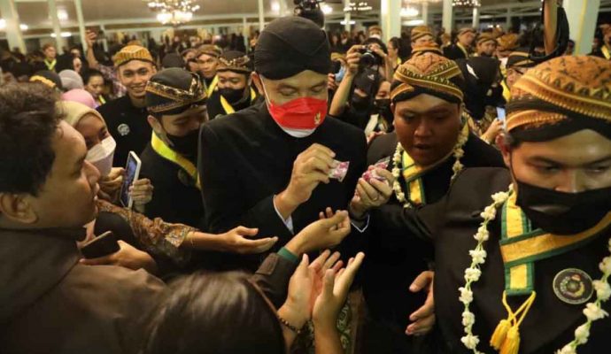 Ini kali pertama Kirab Pusaka dilakukan secara terbuka pascapandemi. Sekira 90 menit, orang nomor satu di Jawa Tengah itu berjalan tanpa alas kaki, seperti prajurit keraton yang lain.