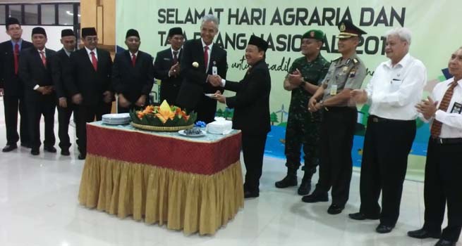 ”ATR/BPN Jateng supaya terus melakukan reformasi dan revolusi serta inovasi dalam memberikan pelayanan sertifikat bidang tanah, sehingga kemudahan yang diberikan bisa mempercepat masyarakat mengurus seertifikat tanahnya,”ungkapnya seusai acara syukuran HUT Kanwil ATR/BPN Jawa Tengah di kantor jalan Ki Mangunsarkoro Semarang, Senin (24/9/2018).