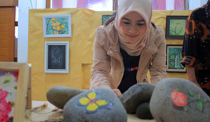 Satu per satu karya seni dilihatnya dengan penuh kekaguman, mulai dari potret aktivitas warga, sudut kota, tokoh hingga goresan-goresan indah lainnya yang sarat makna.