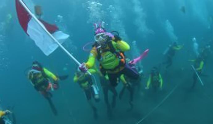 Indonesia baru saja mencatatkan sejarah dunia. Sekitar 600 penyelam memecahkan rekor rangkaian manusia terbanyak di bawah air (Largest Human Chain Underwater).