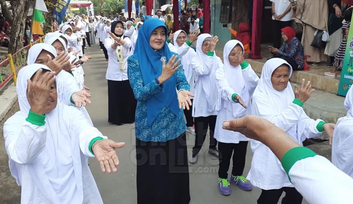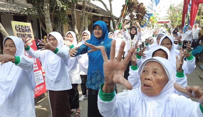 Pemandangan menarik di sepanjang Jalan Dusun Menayu, Desa Menayu, Kecamatan Muntilan, Kabupaten Pagelang. Deretan wanita lanjut usia (Lansia) memenuhi sepanjang jalan kampung, termasuk istri Wakil Bupati Magelang, Islamiah. Mereka mengikuti senam massal dalam kegiatan Pencanangan Kampung Keluarga Berencana (KB) Satria dan Peresmian Rumah Dataku.