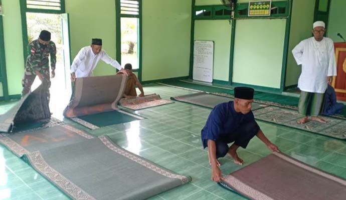 Satgas Pamtas RI-Malaysia Yonif 642/Kapuas Pos Koki Sei Daun bersama warga membersihkan Masjid Al-Kautsar di Desa Malenggang, Kecamatan Sekayam, Kabupaten Sanggau. Jumat (11/12/2020).