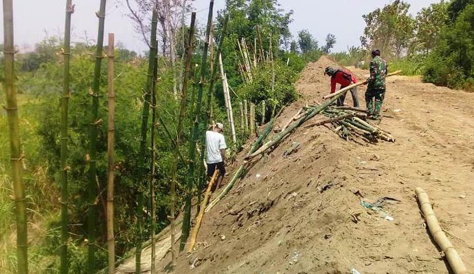 Sebelum tanggul di urug, dilakukan penancapan 700 batang bambu dengan kedalaman dari tanggul hingga dasar sungai mencapai 8-10 meter. Selanjutnya, dipasang sasak untuk menahan tanah. Bambu dan sasak merupakan bantuan dari pihak BBWS dan Dinas Pengelolaan Sumber Daya Air dan Tata Ruang (PSDA) Brebes.