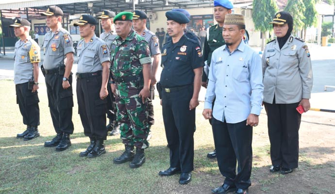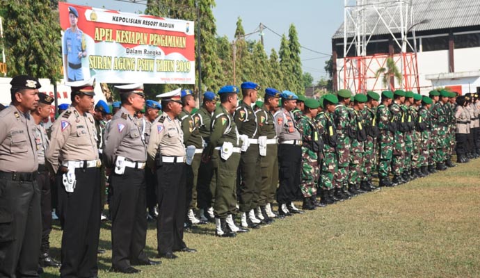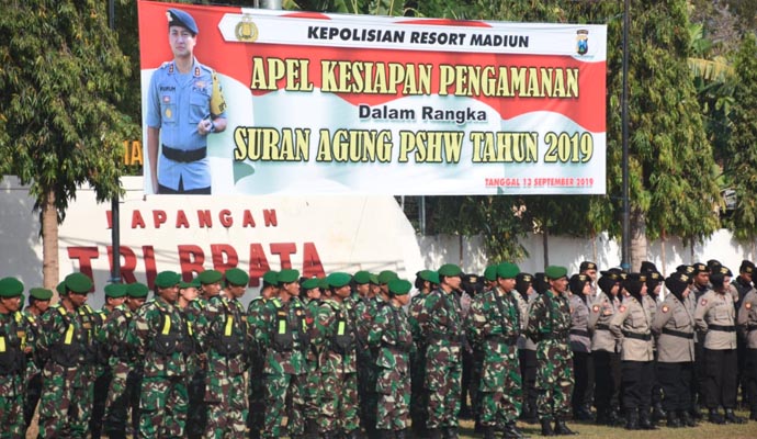 Apel gelar pasukan kesiapan pengamanan menjelang kegiatan Suran Agung 2019 dilaksanakan di lapangan Tri Brata Polres Madiun, Jl. Raya Ponorogo – Madiun No.66, Demangan, Madiun, Kota Madiun, Jumat (13/9/2019).
