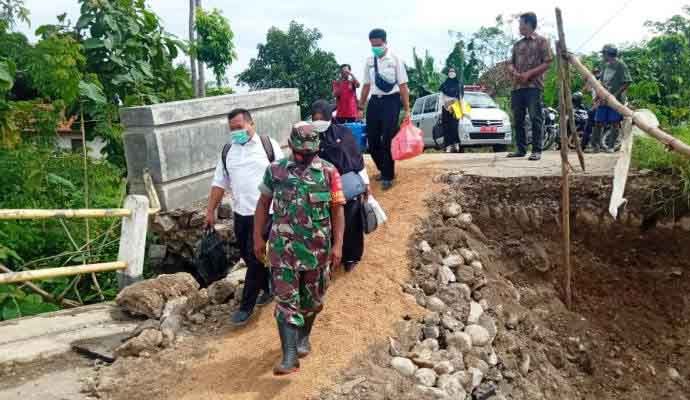 Dijelaskan Pjs. Danramil 16 Larangan Kodim 0713 Brebes, Letda Infanteri M. Yazid, jembatan sepanjang 30 meter lebar 5 meter, tepatnya di Dusun Karangbokong itu amblas sepanjang kurang lebih 10 meter sekitar pukul 22.30 WIB (28/12).